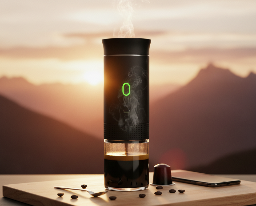 Batterie rechargeable haute capacité intégrée. Tu la recharges sur USB-C (comme ton téléphone) : prise secteur, allume-cigare de camion, powerbank. 2-3 expressos par charge complète. Autonomie totale garantie.