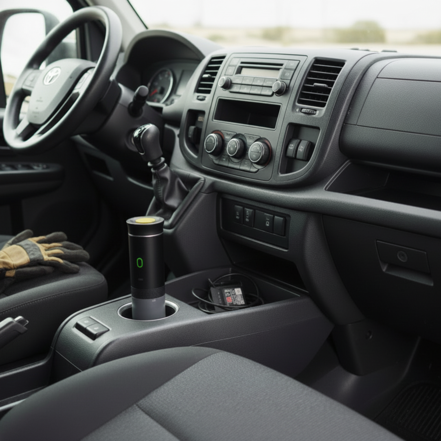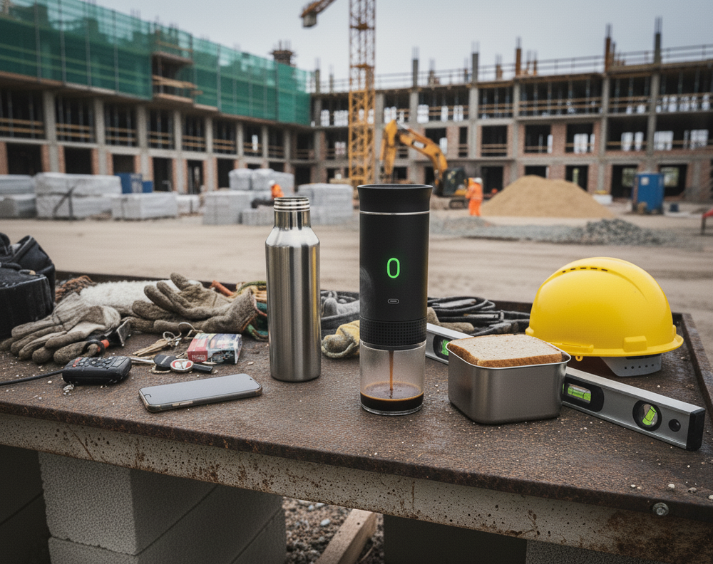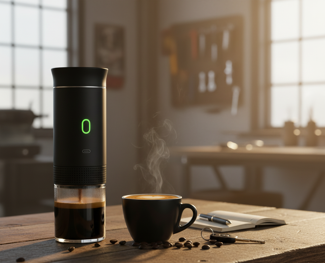 Batterie rechargeable haute capacité intégrée. Tu la recharges sur USB-C (comme ton téléphone) : prise secteur, allume-cigare de camion, powerbank. 2-3 expressos par charge complète. Autonomie totale garantie.