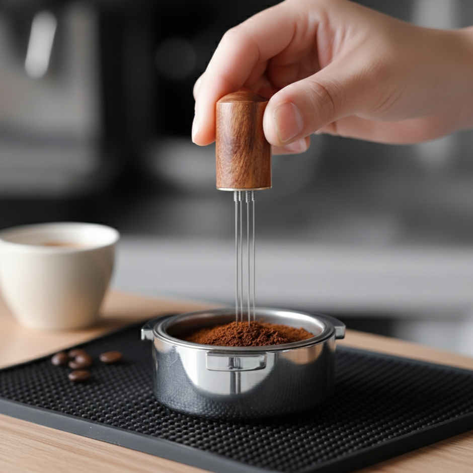 Les baristas de compétition utilisent tous la distribution WDT. Pas par snobisme : parce que ça fonctionne. Distribution uniforme = extraction parfaite = espresso équilibré. Technique pro accessible à tous.